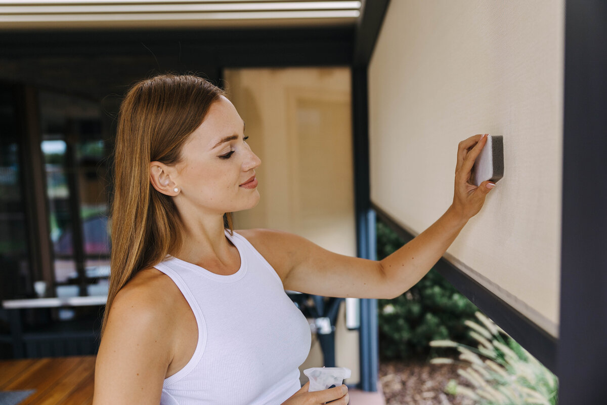 Smetáčkem omeťte rám, vodicí lišty a u rolet lamely a odstraňte viditelné nečistoty a usazený prach. Na dočištění rolet a otření screenové látky postačí měkký hadřík nebo houbička a vlažná voda, do které můžete přidat trochu mýdla či přípravku na mytí nádobí.